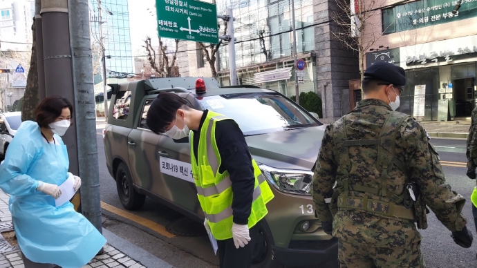 군복을 입은 군인 2명, 맨앞에는 경찰차. 뒤에 승용차 한대 등 총 5대가 백신을 싣고